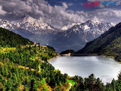 Puzzle Lasy, Górskie, Jezioro, Chmury