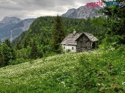 Łąka, Kwiaty, Góry, Lasy, Domek