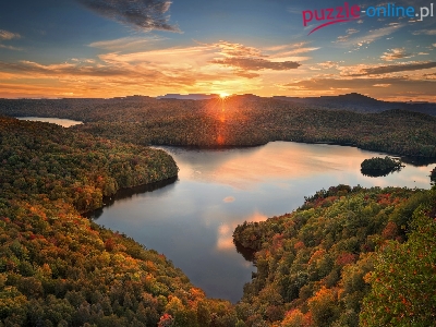 Lasy, Panorama, Jezioro, Zachód Słońca, Jesień