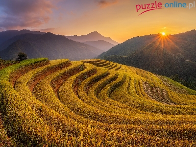 Promienie słońca, Tarasy ryżowe, Pola, Góry, Wietnam, Lasy