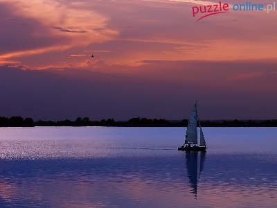Puzzle Lasy, Jezioro, Żaglówka, Zachód słońca