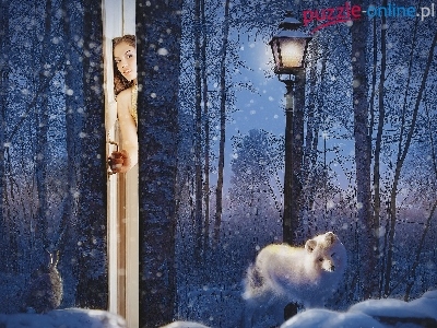 Drzwi, Zima, Biały, Wilk, Drzewa, Zając, Fantasy, Kobieta, Latarnia