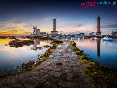 Latarnia morska, Phare dEckmuhl, Droga, Bretania, Kersuluan, Łódki, Francja, Wybrzeże