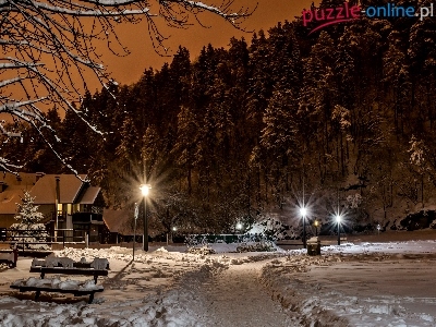 Latarnie, Drzewa, Chorwacja, Zima, Dom, Ławki