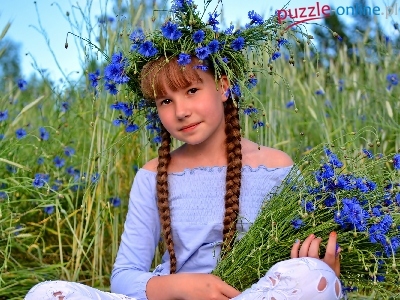 Lato, Kwiaty, Dziewczynka, Wianek, Łąka