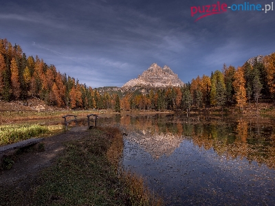 Jesień, Jezioro, Prowincja Belluno, Włochy, Drzewa, Antorno Lake, Góry Dolomity, Mostek, Las, Masyw Tre Cime di Lavaredo