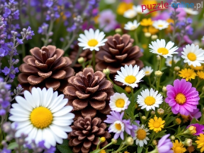 Kolorowe, Lawenda, Kwiaty, Szyszki, Stokrotki