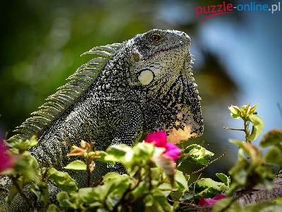 Puzzle Jaszczurka, Legwan zielony, Iguana, Kwiaty