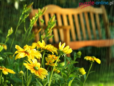 Puzzle Ławka, Żółte, Kwiaty, Letni Deszcz