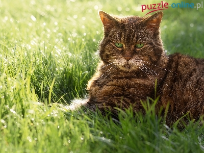 Zielonooki, Leżący, Bury, Trawa, Kot