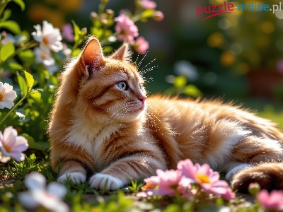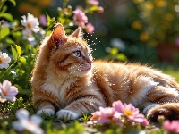 Kot, Leżący, Rudy, Spojrzenie, Kwiaty
