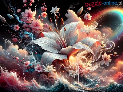 Grafika, Lilia, Kwiaty, Fale, Chmury