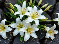 Kwiaty, Lilie, Białe, Krople, Kamienie