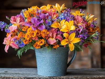 Dzbanek, Kolorowe, Kwiaty, Lilie, Deski, Bukiet