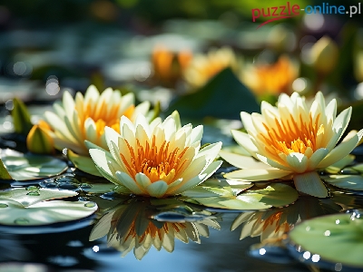 Puzzle Liście, Biało-pomarańczowe, Lilie wodne, Woda
