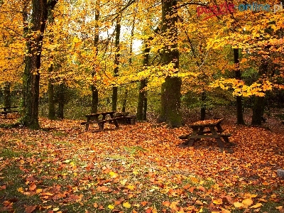 Liście, Jesień, Park, Ławeczki, Drzewa
