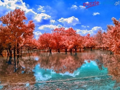 Puzzle Liście, Drzewa, Czerwone, Jezioro