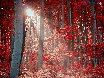 Liście, Drzewa, Słońca, Las, Czerwone, Promienie