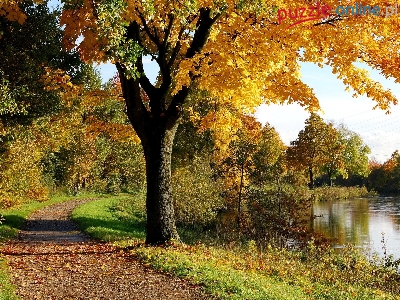 Puzzle Liście, Rzeka, Droga, Jesień