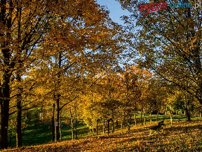 Liście, Park, Niebo, Jesień, Drzewa, Ławka