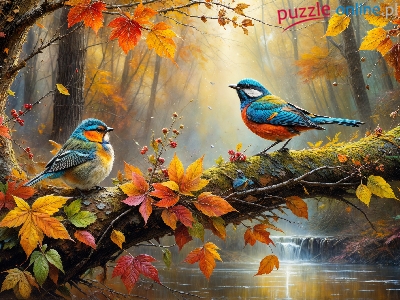 Liście, Kolorowe, Ptaki, Gałąź, Las, Jesień, Grafika, Pożółkłe, Rzeka