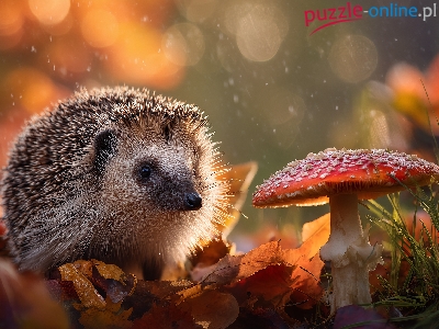 Jesienne, Jeż, Grzyb, Grafika AI, Czerwony, Muchomor, Liście