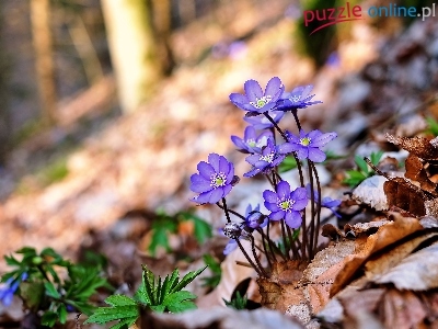 Liście, przylaszczki, Wiosna, Niebieskie, Las, Drzewa