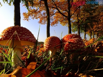Puzzle Liście, Grzyby, Muchomory, Drzewa