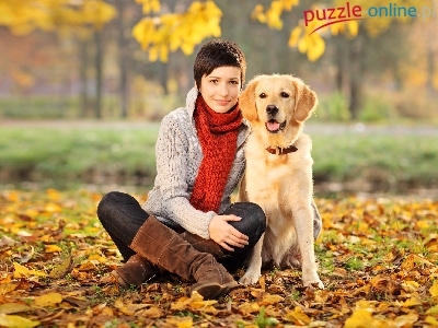Puzzle Liście, Kobieta, Pies, Szal