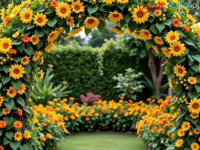 Liście, Grafika AI, Kwiaty, Łuk, Kwiaty, Pomarańczowe, Ogród, Żółte