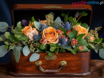 Puzzle Róże, Skrzynka, Kwiaty, Liście