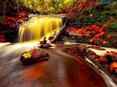 Puzzle Liście, Wodospad, Rzeczka, Drzewa