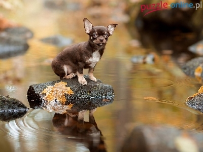 Puzzle Liście, Chihuahua krótkowłosa, Rzeka, Kamienie