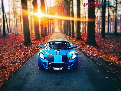 Lotus, Liście, Zachód, Jesień, Droga, Samochód, Drzewa, Słońca