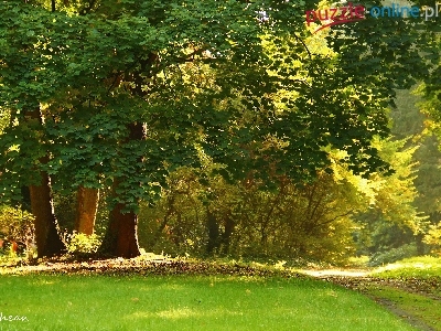 Liście, Ścieżka, Drzewa, Trawa, Jesień