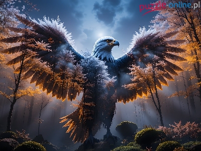 Skrzydła, Grafika, Zielony, Orzeł, Krajobraz, Liście, Światło, Drapieżny, Komputerowa, Ptak, Natura, Drzewa, Kamienie, Podświetlenie, Pióra, Mech, Przyroda, Mgła