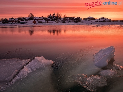 Rzeka, Obwód murmański, Rosja, Wieś Kowda, Niebo, Odbicie, Kry lodowe, Zima, Kolorowe
