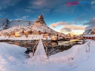 Zima, Lofoty, Domki, Norwegia, Wioska Reine, Góry