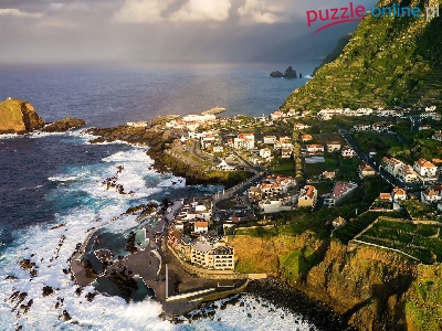 Madera, Portugalia, Porto Moniz, Opadająca, Mgła, Domy, Morze, Góra