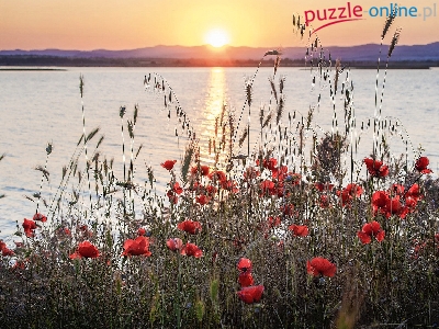 Maki, Góry, Lato, Jezioro, Świt, Zboże, Wschód słońca, Kwiaty, Brzeg