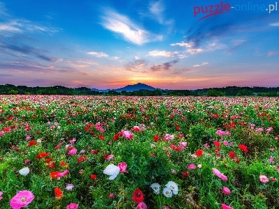 Maki, Zachód słońca, Łąka, Kwiaty, Wzgórza