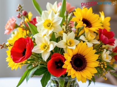 Bukiet, Słoneczniki, Kwiaty, Maki, Wazon, Narcyzy