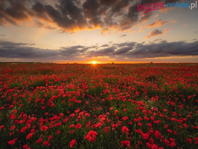 Chmury, Kwiaty, Pole, Maki, Zachód słońca, Niebo
