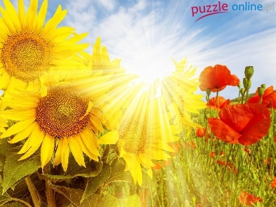 Łąka, Słońca, Słoneczniki, Maki, Promienie