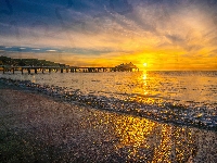Malibu, Wschód słońca, Plaża, Stany Zjednoczone, Molo, Morze, Kalifornia