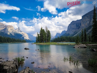 Park Narodowy Jasper, Kanada, Brzeg, Jezioro, Maligne Lake, Kamienie, Góry, Drzewa