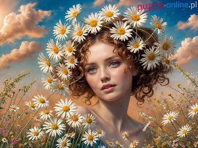 Dziewczyna, Margerytki, Kwiaty, Grafika, Wianek