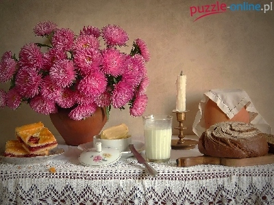 Ciasto, Szklanka, Masło, Astry, Serweta, Kompozycja, Nóż, Mleko, Bukiet, Chleb, Świeczka