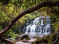 Mech, Las, Kamienie, Nowa Zelandia, Wodospad, Drzewa, Purakaunui Falls