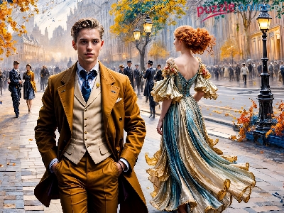 Ulica, Kobieta, Rudowłosa, Mężczyzna, Grafika, Garnitur